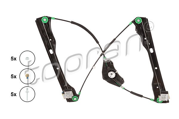 - Podnożnik szyby: Podnożnik cięgnowy z podwójnym prowadzeniem