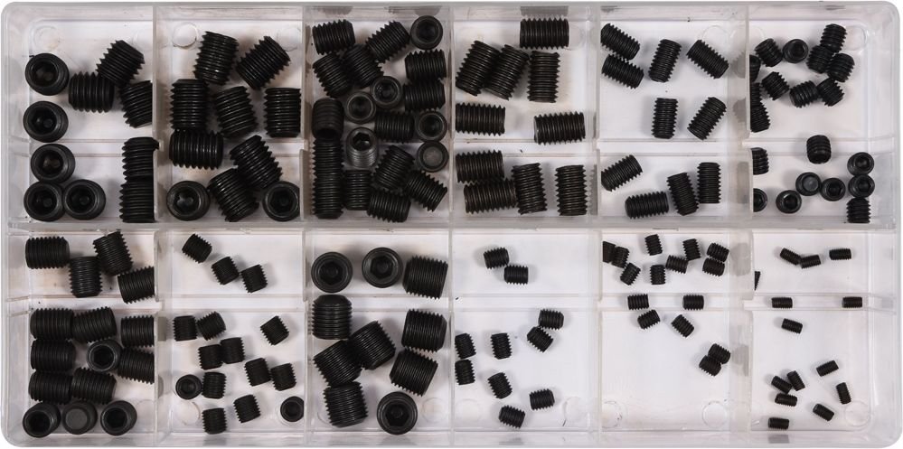 Zestaw 160 sztuk śrub imbusowych bez łba - ustalających. Zestaw zawiera rozmiary od 3x5 mm do 10x12 mm. Całość umieszczono w wygodnym opakowaniu typu "sortownik".