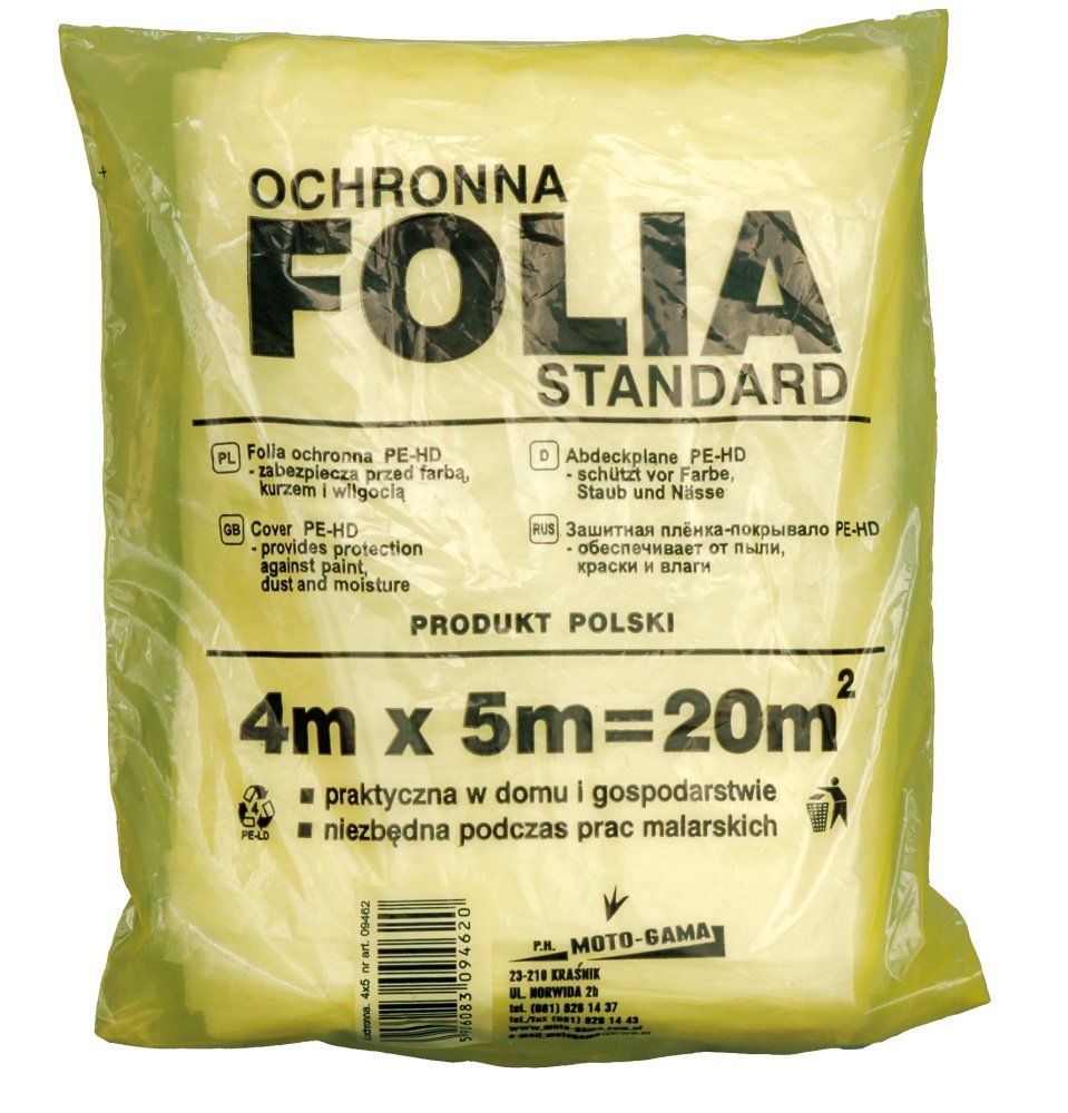 Folia malarska o rozmiarze 4x5 m. Służy do czasowego zabezpieczania przed zabrudzeniem i uszkodzeniem w trakcie prac remontowo-budowlanych. Zapewnia czystość i wygodę pracy.Dane techniczne