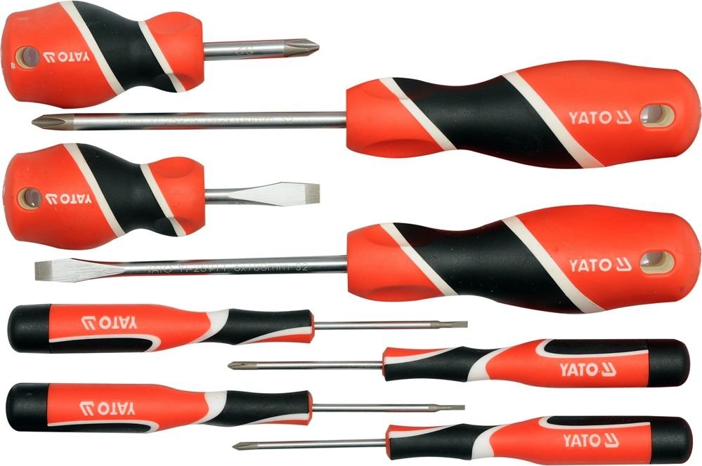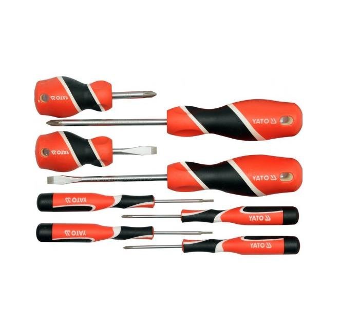 Zestaw ośmiu profesjonalnych wkrętaków.Trzpień wykonany ze stali o symbolu S2, utwardzany do około 58 HRC. Powierzchnia trzpienia satynowana, końcówka robocza utwardzana i piaskowana / wzmacnia to stabilność grota /. Rękojeść wykonana z odpowiednio dobranych tworzyw o różnych twardościach